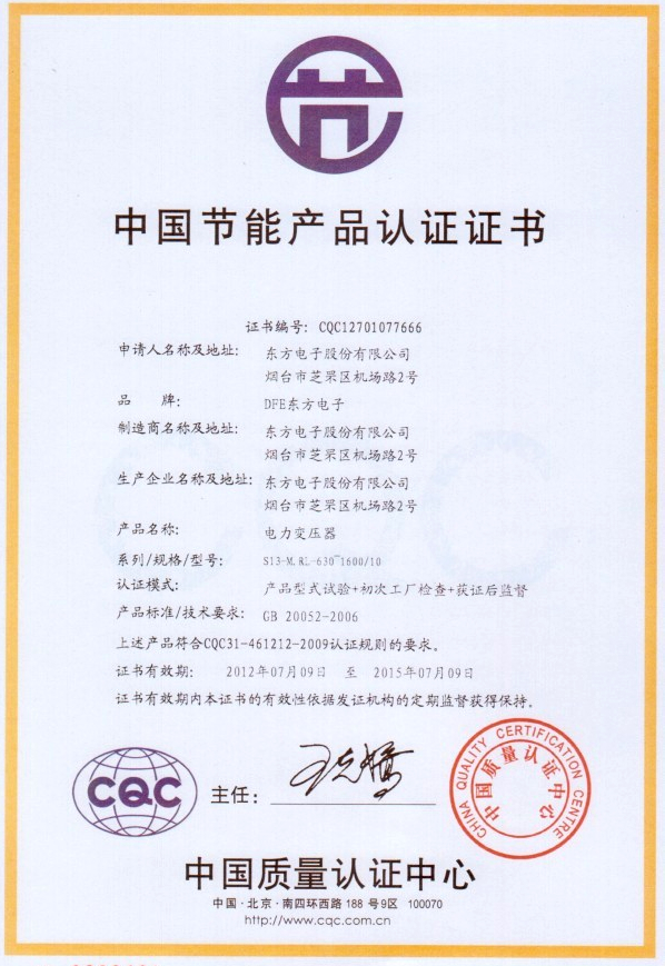 2012年7月,經(jīng)中國(guó)質(zhì)量認(rèn)證中心最終綜合評(píng)檢,我公司變壓器事業(yè)部喜獲“中國(guó)節(jié)能產(chǎn)品認(rèn)證證書(shū)”,并取得CQC認(rèn)證標(biāo)志使用批準(zhǔn)書(shū)。