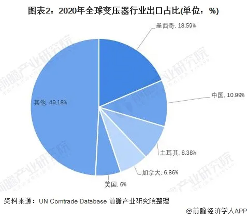 從全球變壓器出口占比來看,由于變壓器屬于技術(shù)密集型產(chǎn)業(yè),市場集中度高,生產(chǎn)各類變壓器的企業(yè)大多集中在墨西哥、加拿大等國家,排名前五的國家占據(jù)出口額的一半以上。由于我國變壓器產(chǎn)品我國占比第二,達到10.99%。排名前五的國家還有墨西哥、土耳其、加拿大和美國,占比分別為18.59%、8.38%、6.86%和6%。