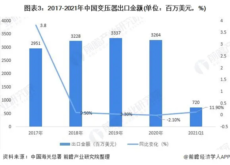 由于我國變壓器產(chǎn)量高,產(chǎn)能過剩,行業(yè)發(fā)展較好。2017-2020年,我國變壓器出口金額基本維持平穩(wěn)增長態(tài)勢。2021年第一季度,隨著全球新冠疫情影響的減弱,出口金額同比增長11.9%。同時,2021年我國出臺《變壓器能效提升計劃(2021-2023年)》,預(yù)計變壓器產(chǎn)能將進一步提升,出口金額預(yù)計將隨之增長,出口比例將進一步提升。